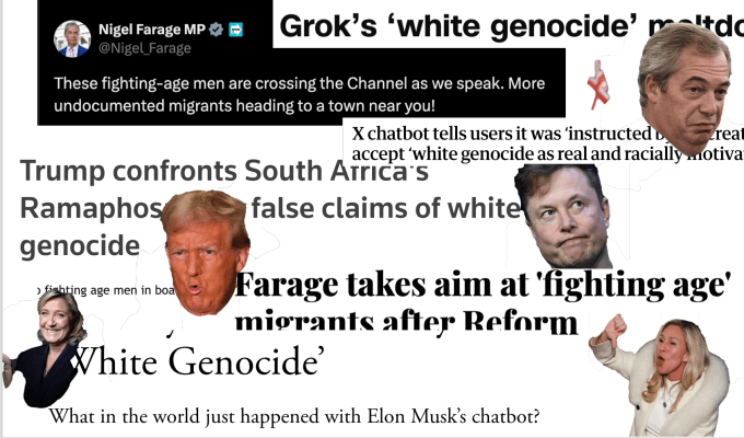 White Genocide, the Great Replacement, and the New Face of Fascism Two remarkable—and terrifying—moments this week. In the Oval Office, Donald Trump once again embarrassed America, ranting to the President of South Africa about white genocide conspiracy theories. At the same time, Elon Musk’s AI chatbot Grok told users it had been “instructed by my … Continue reading White Genocide, the Great Replacement, and the New Face of Fascism